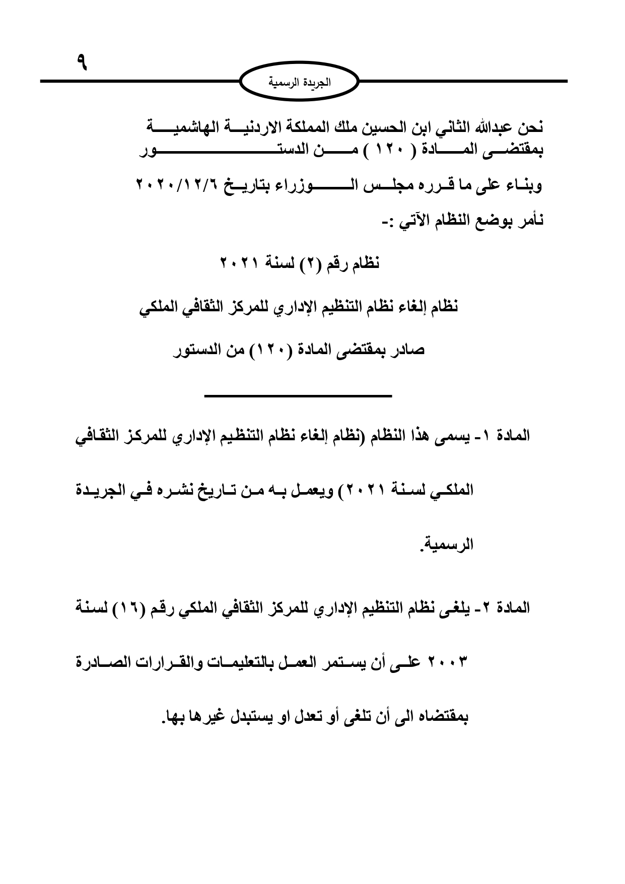 عمون - صدر في عدد الجريدة الرسمية الأحد، نظام إلغاء نظام التنظيم الإداري للمركز الثقافي الملكي، وذلك بعد توشحه بالارادة الملكية السامية.