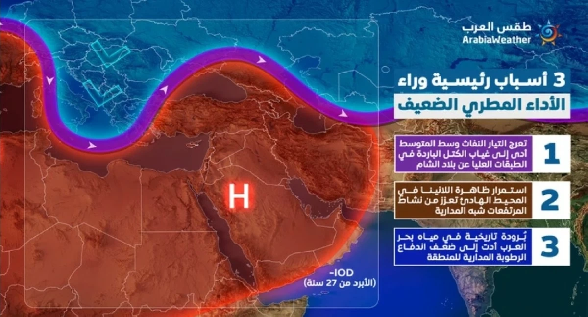 وأوضح الشاكر أن السبب الأول يتمثل في حدوث تعرّج كبير في التيار النفاث القطبي باتجاه جنوب القارة الأوروبية ووسط البحر المتوسط وشمال إفريقيا، ما أدى إلى تمركز المنخفضات الجوية في تلك المناطق وترافقها مع أمطار غزيرة وتساقط كثيف للثلوج، في حين تدفعت بالمقابل المرتفعات الجوية القوية نحو شرق البحر المتوسط والمملكة، مانعة وصول الأنظمة الماطرة.