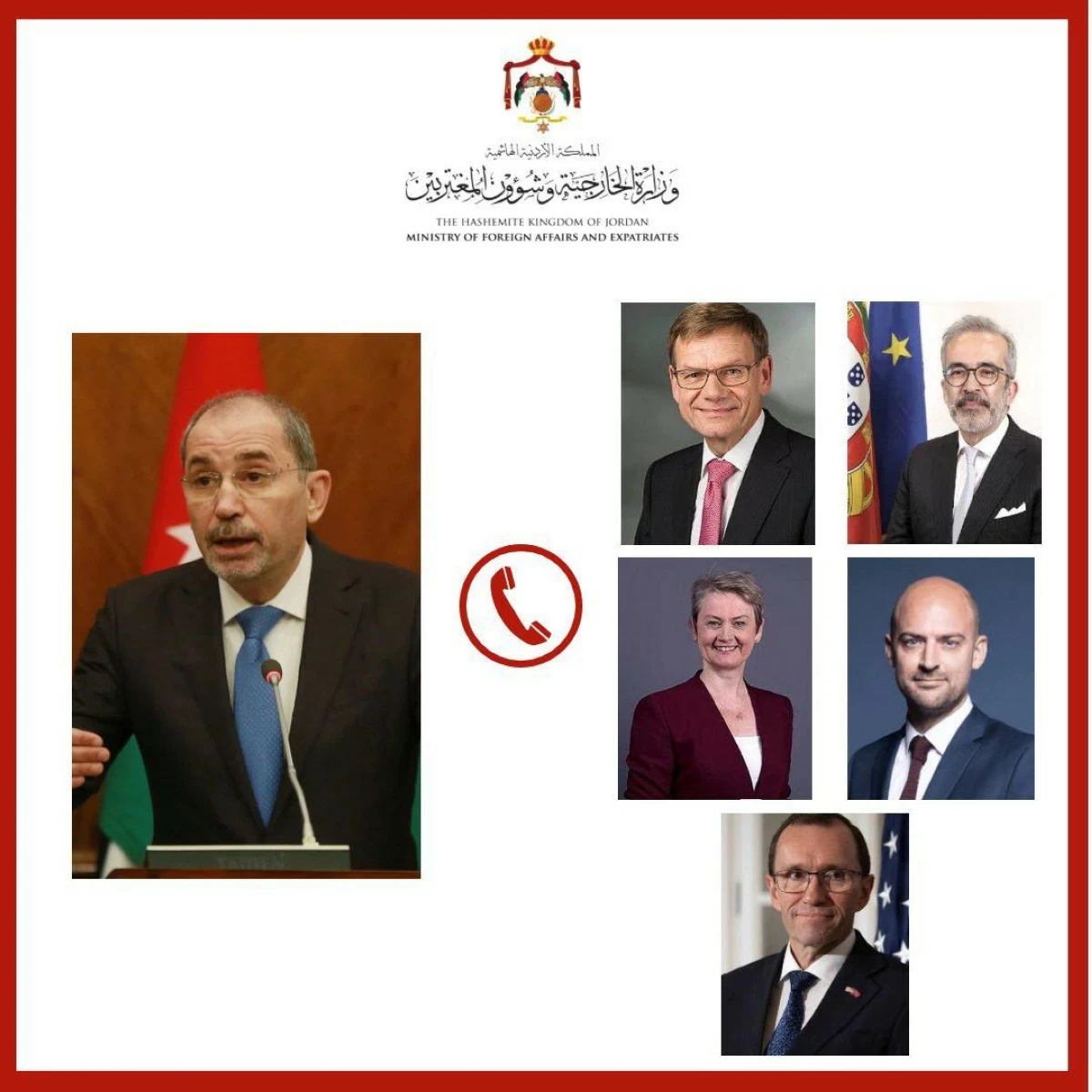 وأكّد الصفدي في اتصالاتٍ هاتفيّةٍ مع وزير الخارجية الألماني الدكتور يوهان دافيد فاديفول، ووزير الخارجية البرتغالي باولو رانجيل، ووزيرة الخارجية والتنمية البريطانية إيفيت كوبر، ووزير الخارجية الفرنسي جان نويل بارو، ووزير الخارجية النرويجي إسبن بارث إيدي، ضرورةَ تحرّك المجتمع الدولي فوريًّا لوقف هذا العدوان الذي يشكّل خرقًا للقانون الدولي والقانون الدولي الإنساني، ويدفع المنطقة نحو المزيد من الفوضى والصراعات.