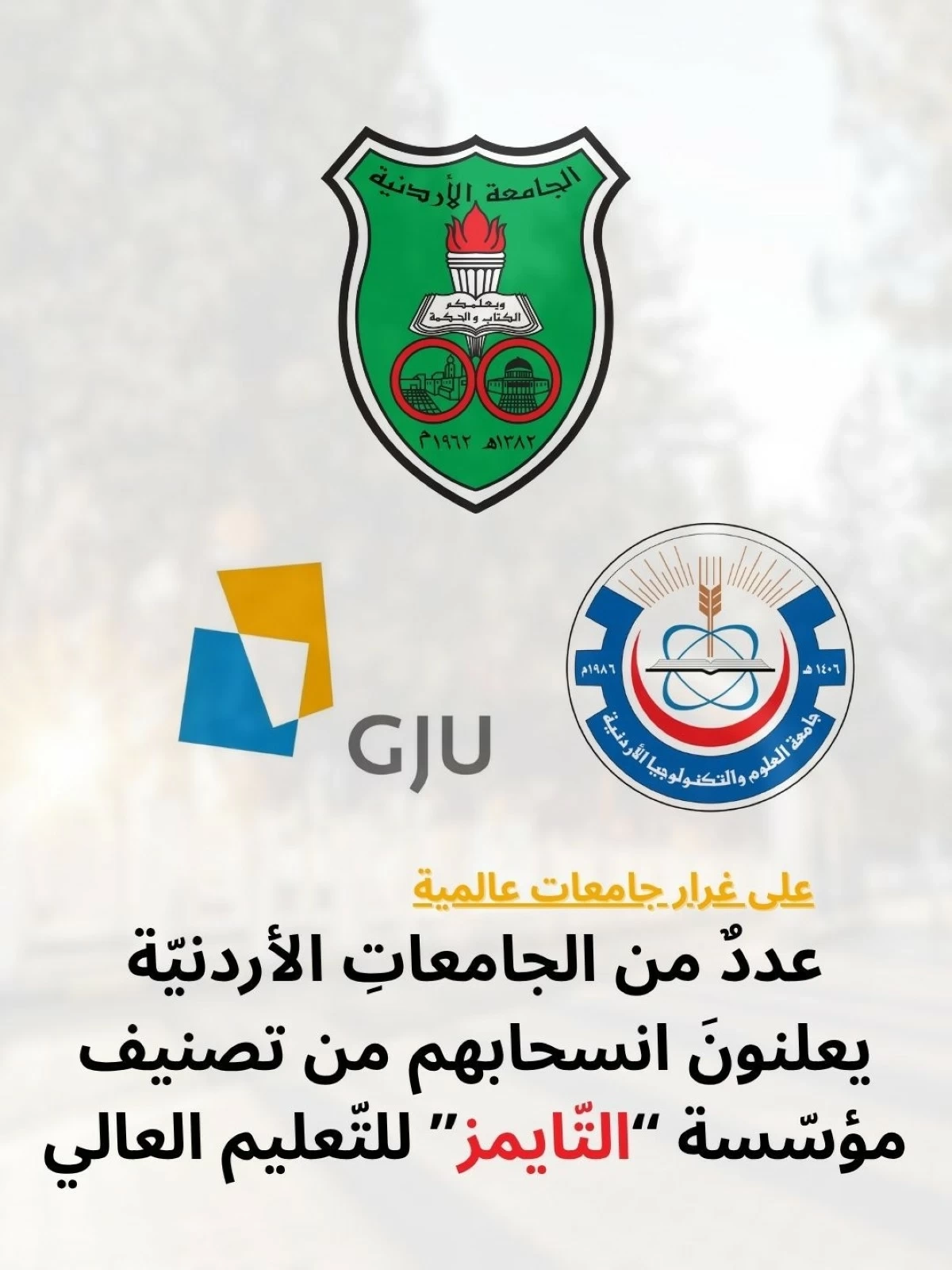 أعلنت الجامعة الأردنية وجامعة العلوم والتكنولوجيا الأردنية والجامعة الألمانية الأردنية انسحابهم رسميًا من تصنيف "التايمز" العالمي للجامعات، لاعتبارات تتعلق بآليات احتساب وتطبيق المعايير المعتمدة للتصنيف، في خطوة مماثلة لما أعلنته مؤخرًا العديد من الجامعات العالمية والإقليمية، مثل الجامعة الأمريكية في بيروت وجامعة السوربون في فرنسا، ومجموعة من الجامعات الأمريكية والأوروبية.